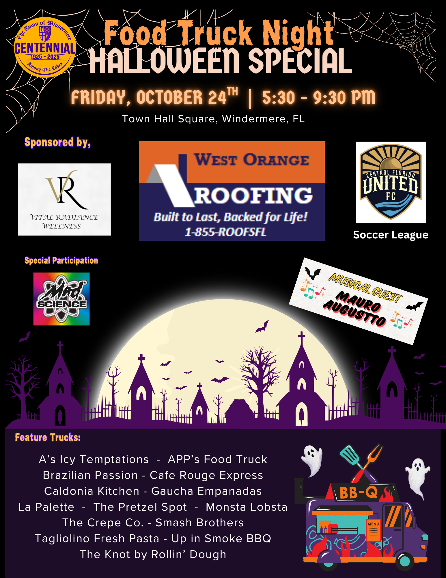 Windermere’s Food Truck night takes place January – December, from 5:30 to 9:30 pm on 4th Fridays* at Town Square Park.