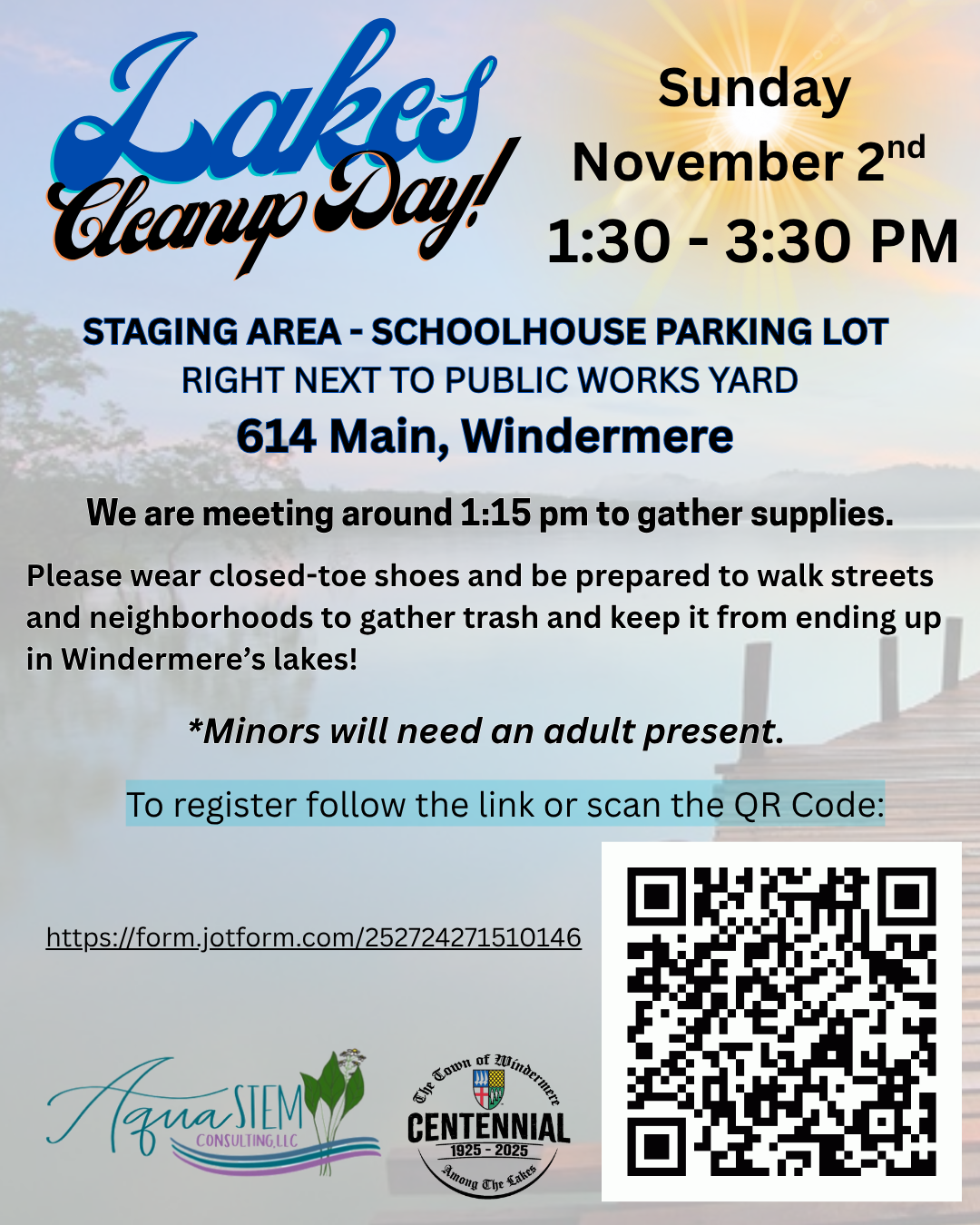 Please wear closed-toed shoes and be prepared to walk down streets and through neighborhoods gathering trash to help prevent refuse from ending up in Windermere’s lakes.