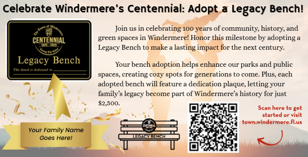Your bench adoption helps enhance our parks and public spaces, creating cozy spots for generations to come. Plus, each adopted bench will feature a dedication plaque, letting your family’s legacy become part of Windermere’s history for just $2,500.